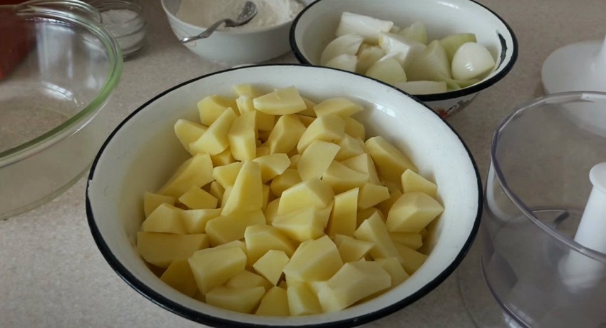 Oloupejte cibuli a nakrájejte na kostičky. Brambory oškrábejte škrabkou, omyjte a nakrájejte na větší kousky.