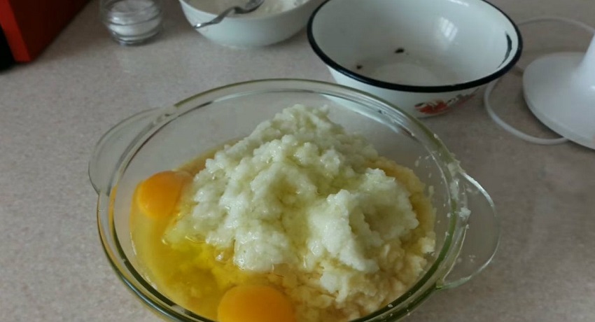 Pomocí mixéru rozmixujte směs cibule a brambor na hladké těsto. Rozklepněte vejce a přidejte do těsta, dobře promíchejte.