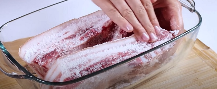 Bůček si nejprve potřete hrubou solí a dejte ho do hrnce. Pak maso přikryjte víkem a nechte marinovat po dobu pěti až osmi hodin na chladném místě. Zhruba jednou za hodinu maso obraťte.