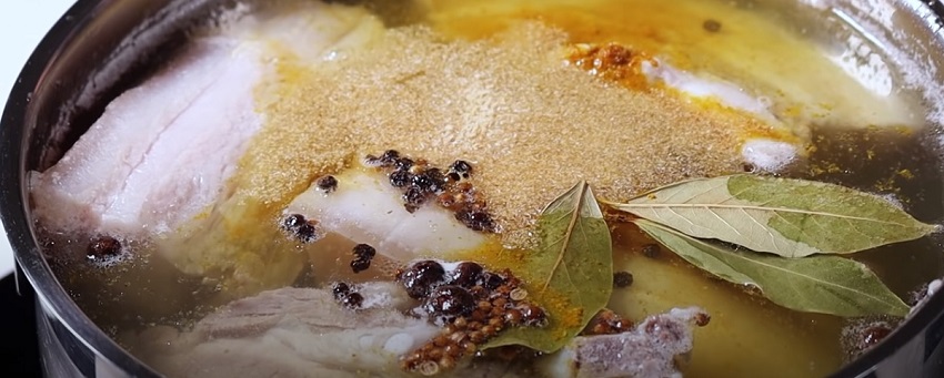 Po uplynutí doby marinování bůček případně překrojte na mění kusy a podlijte vodou. Do hrnce také přidejte bobkové listy, nové koření, černý pepř, koriandr, mletou kurkumu, granulovaný česnek a oloupané stroužky česneku.