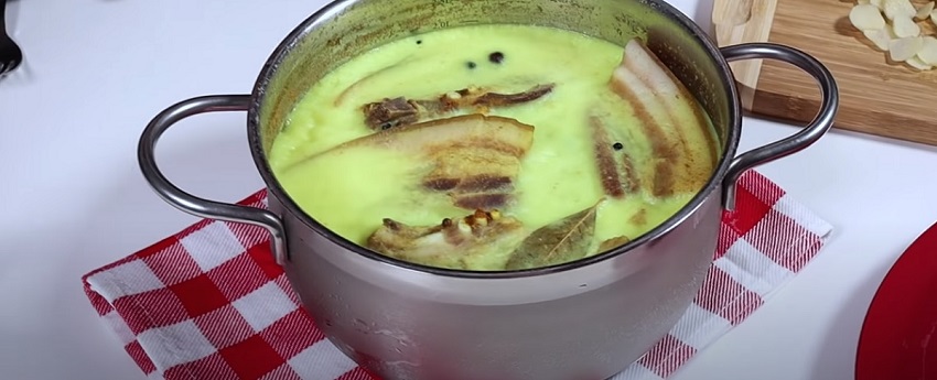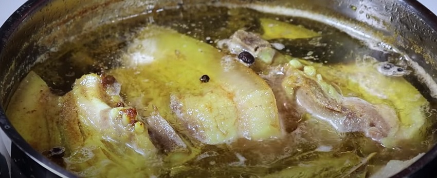 Bůček pak vařte v kořeněné vodě asi 45 až 60 minut na mírném plamenu. Hrnec je možné na půl zakrýt poklicí. Až uplyne doba varu, vypněte sporák a nechte maso chladnout ve vývaru.