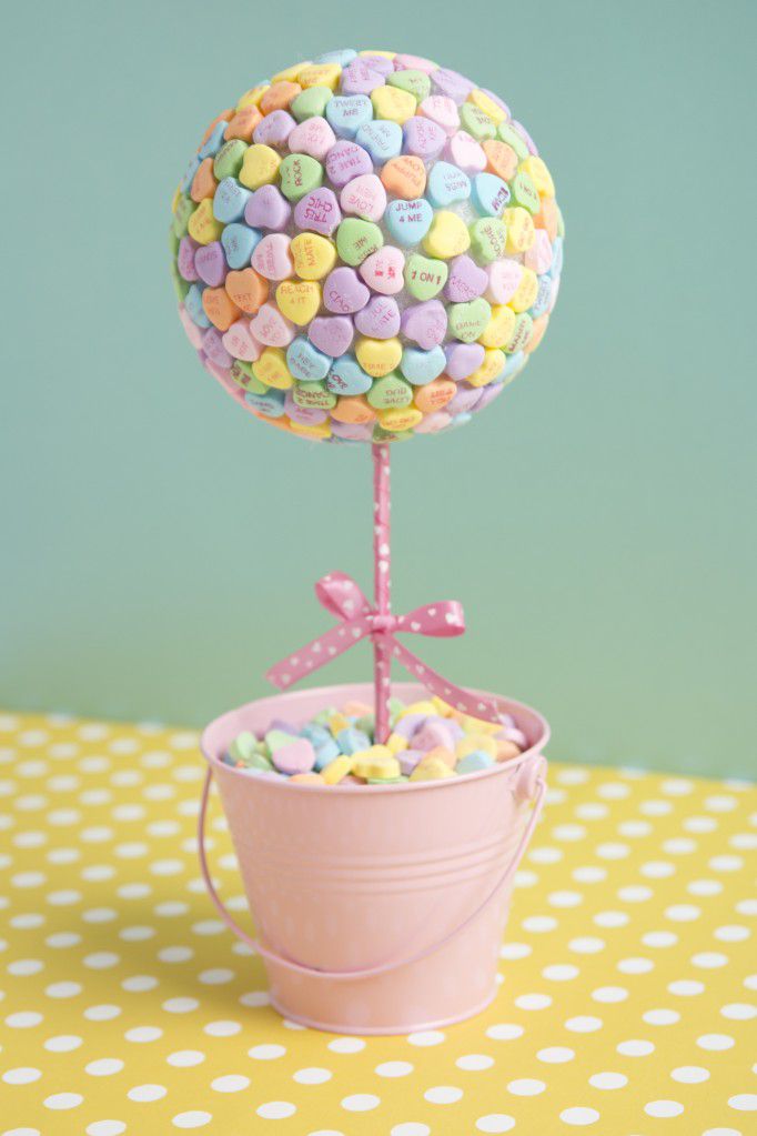 Na tento stromeček budete potřebovat polystyrenovou kouli, špejli, polystyren do kbelíčku, kbelíček či malý květináč a bonbóny. Špejli zapíchnete do polystyrenové koule a omotáte ji stužkou. Na kouli přilepíte bonbony. Stromeček zapíchnete do polystyrenu v kbelíčku a nasypete nahoru bonbony.