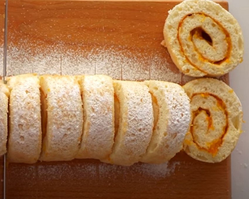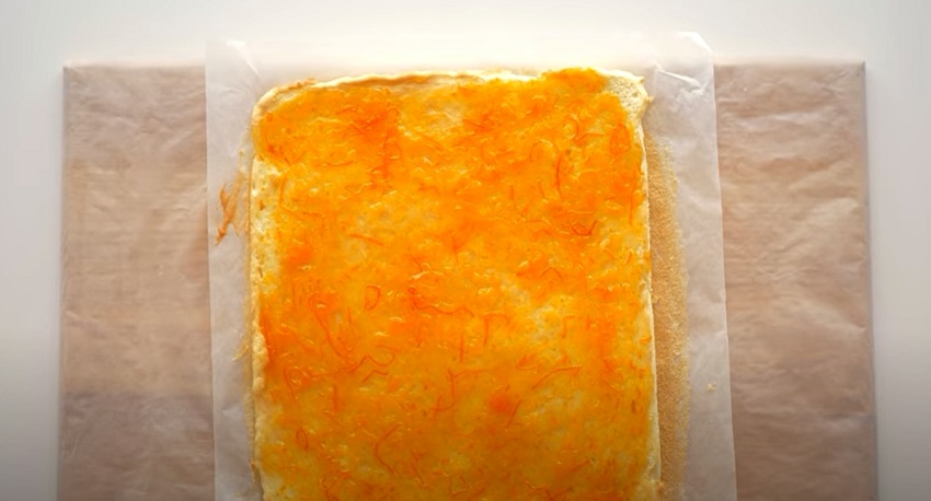 Po upečení korpus vyjměte, pomažte pomerančovým džemem a opatrně zarolujte do rolády.
