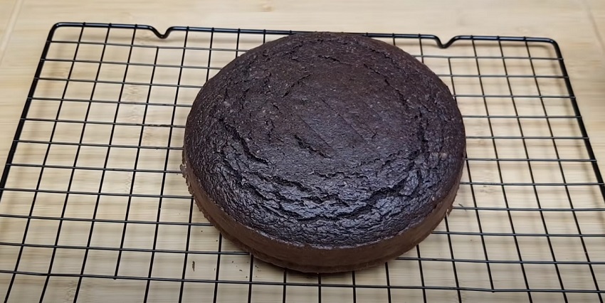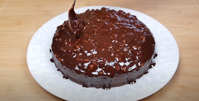 Stav upečení zkontrolujte pomocí párátka nebo opačného konce lžičky. Nakonec korpus vyjměte, vyklopte z formy a přelijte glazurou zhotovenou z výše uvedených ingrediencí (ve vodní lázni). Dort posypte drcenými restovanými arašídy a nechte polevu ztuhnout.