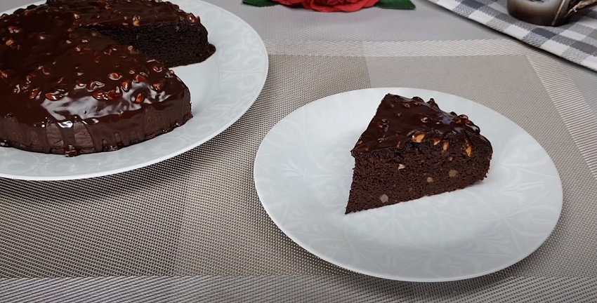Stav upečení zkontrolujte pomocí párátka nebo opačného konce lžičky. Nakonec korpus vyjměte, vyklopte z formy a přelijte glazurou zhotovenou z výše uvedených ingrediencí (ve vodní lázni). Dort posypte drcenými restovanými arašídy a nechte polevu ztuhnout.
