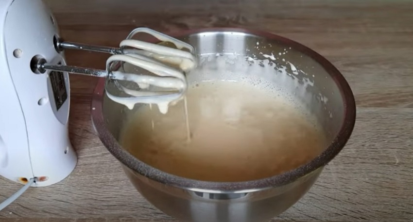 Nejprve si v míse vyšlehejte vejce s krupicovým cukrem do pěny. Poté přilijte slunečnicový olej, mléko, vsypte kypřící prášek, polohrubou mouku a vypracujte metličkou hladké polotekuté těsto.