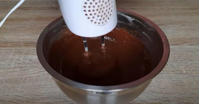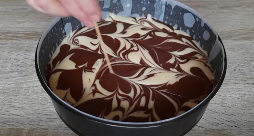 Až vytvoříte homogenní hmotu, vlijte ji na vanilkové těsto po celé ploše. Po upečení vám vznikne mramorování.