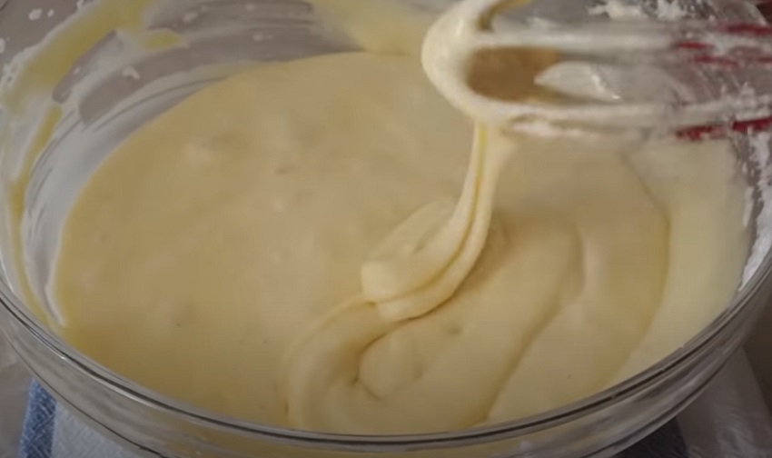 V první řadě připravte těsto. Oddělte bílky od žloutků. Do misky s bílky přidejte špetku soli a šlehejte, dokud nezískáte pevnou hmotu. Do misky se žloutky přidejte cukr, rozpuštěné máslo a promíchejte mixérem. Přidejte vanilkový cukr, škrob, mouku a prášek do pečiva do žloutkové mísy a poté míchejte při nízké rychlosti, dokud nezískáte hladké těsto. Začleňte bílky. Opatrně promíchejte.