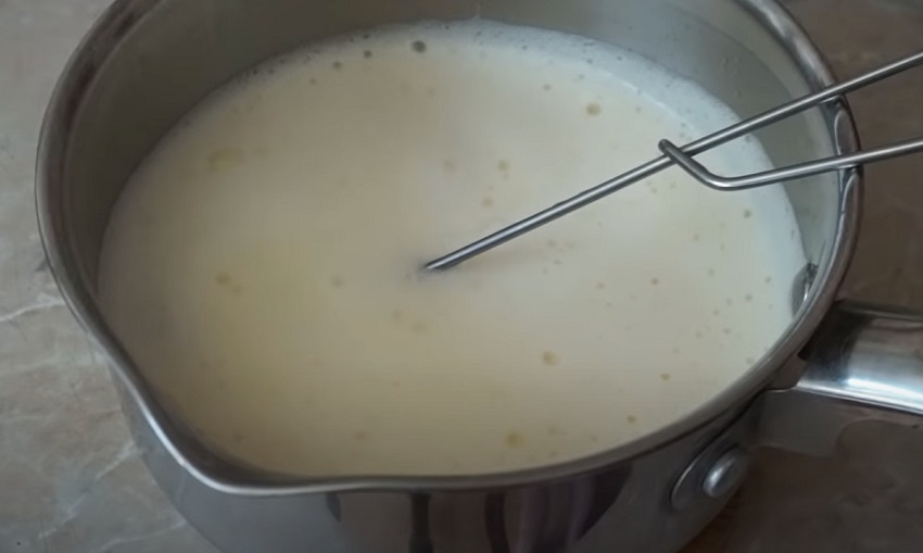Připravte si krém. Smíchejte želatinu s 2-3 lžícemi vody a nechte 5-10 minut. Přidejte žloutky, poté vanilkový cukr, cukr, špetku soli, mléko a dobře promíchejte.